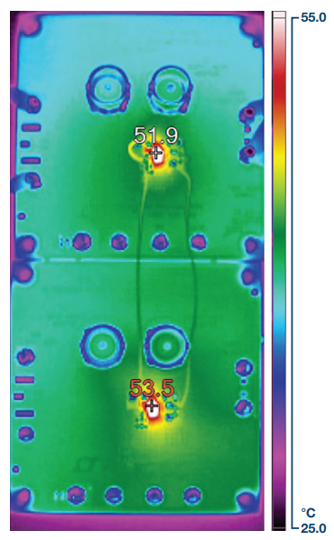 图 4 显示了图 3 中电路的热性能,其中输入电压为 −5 V,输出电压为 −3.3 V,运行于 1A 负载电流下。每个器件的温度大约升至 50°C,表明热量均匀分布。对于更高输出电流和更低输出噪声,可以并联的器件数量没有限制。