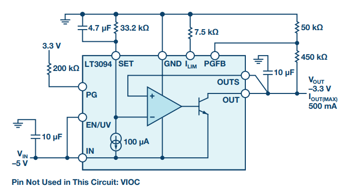 LT3094 是一款具有超低噪声和超高 PSRR 的负 LDO 稳压器。它采用基于电流基准的架构,可使噪声和 PSRR 性能独立于输出电压,多个 LT3094 可以轻松并联,以增加负载电流并降低输出噪声。当 LT3094 用于对开关转换器进行后置调节时,VIOC 功能可以较大限度地降低 LDO 稳压器的功耗,使其成为可变输出电压应用的理想选择。