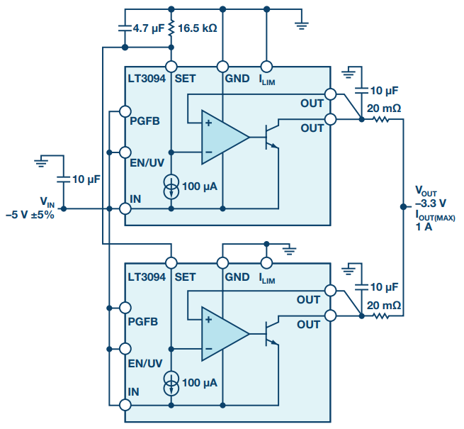 LT3094 可以轻松并联以增加输出电流。图 3 显示了使用两个并联的 LT3094 实现 1A 输出电流的解决方案。为了使两个器件并联,将 SET 引脚连接在一起,并在 SET 引脚和地之间放置一个SET 电阻 RSET。流过RSET的电流为 200 µA,是单个器件中 SET 电 流量的两倍。为了获得良好的均流特性,LT3094 的每个输出都使用一个 20 mΩ 的小镇流电阻。