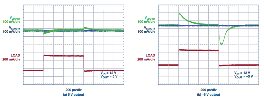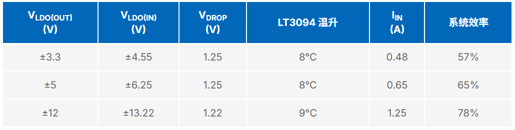 电路在 12 V 输入下运行的热图像如图 6 所示。当输出电压从±3.3 V 变化至 ±12 V 时,LT3094 的温升保持不变。表 2 列出了所有三款器件的电压和电流。图 7 显示了在 12 V 输入下的 ±5 V 电源瞬态响应。