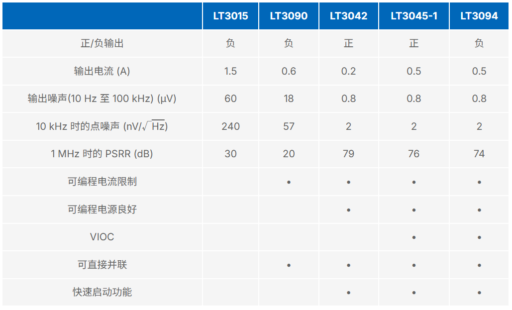 表 1. LT3094 和低噪声 LDO 的特性