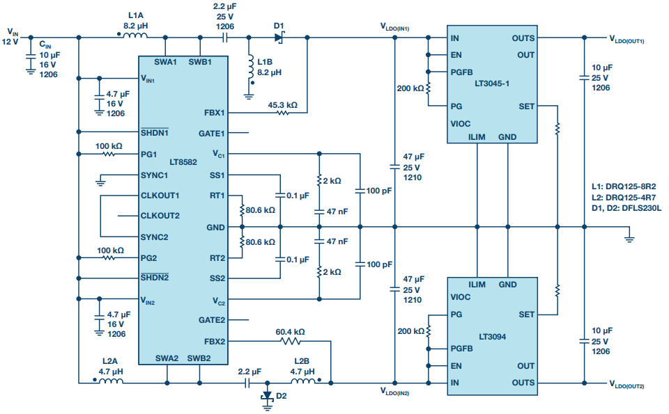 图 5 是使用LT8582、LT3045-1 和 LT3094 的双电源原理图。 LT8582 是一款具有内置开关的双通道 PWM DC/DC 转换器,能够从单个输入产生正输出和负输出。LT8582 的第一个通道配置为 SEPIC 用于产生正输出,第二个通道是反相转换器用于产生负电源轨。在负电源轨中,LT3094 两端的电压由 VIOC 电压控制