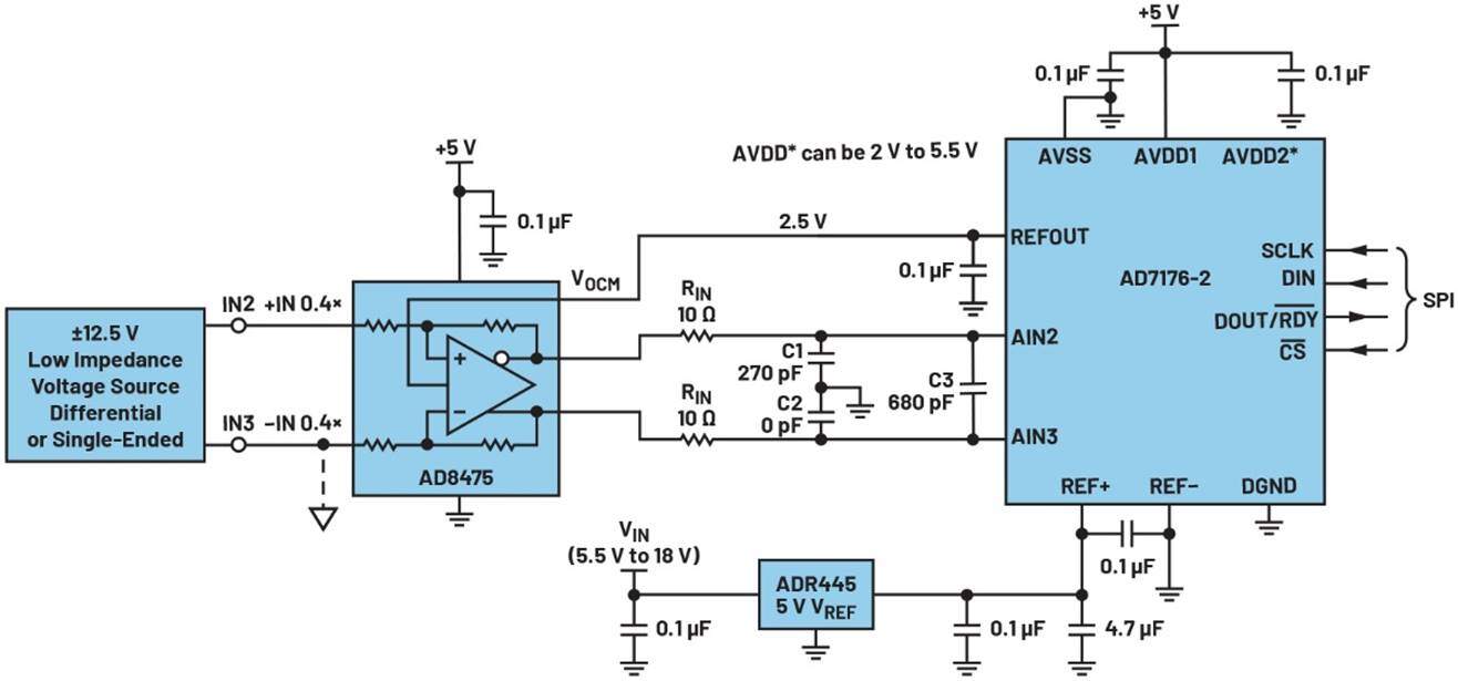 图13.全差分放大器驱动高精度ADC(参考电路笔记CN-0310)。