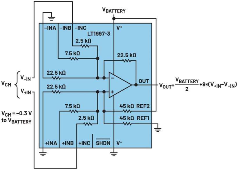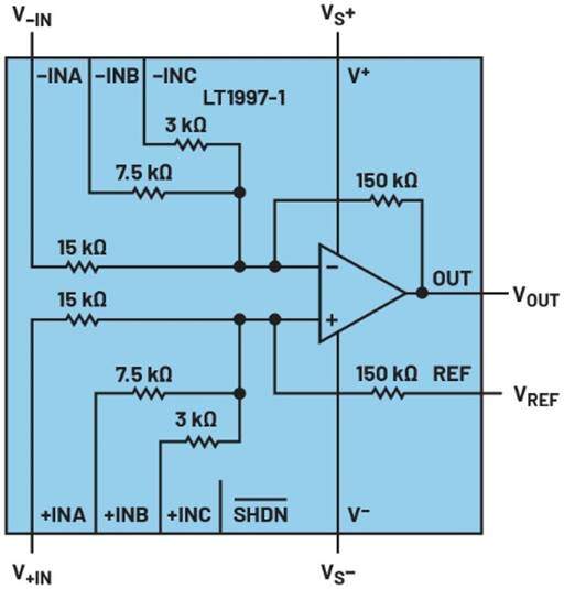 图4.LT1997-1集成差动放大器(针对10 V/V的增益配置)。