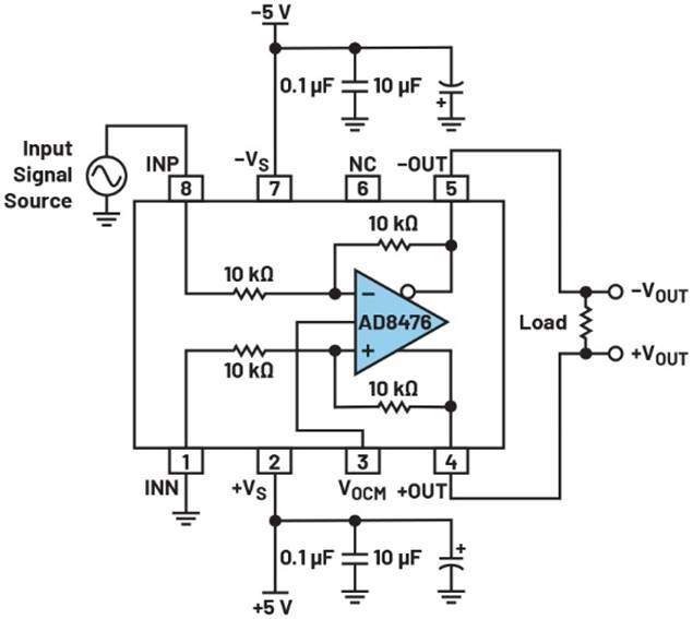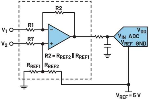 图5.使用差动放大器放大精密差模信号。