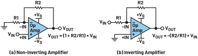 图1.单端(a)同相放大器和(b)反相放大器。