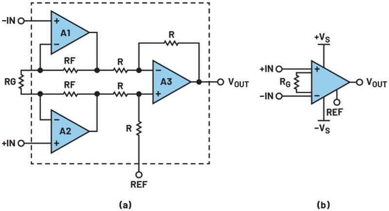 图12.(a) 3运算放大器仪表放大器拓扑和(b)单芯片仪表放大器集成电路。