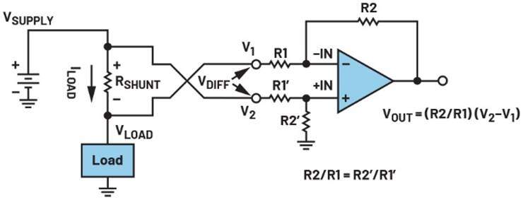 对于高边差模电流检测,必须考虑两个电压:差模电压(VDIFF),即输入V2和输入V1之间的信号电压(分流电阻上的电压);还有共模电压(VCM),存在于V2和V1上。在此示例中,运算放大器的+IN输入为电压VSUPPLY(或VLOAD + VDIFF),运算放大器的–IN输入为电压VLOAD(或VSUPPLY – VDIFF)。差动放大器将放大差模电压并抑制共模电压。