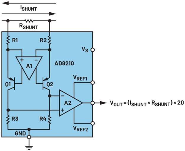 如前所述,单芯片差动放大器适合许多应用,其中一个常见的应用是使用低阻值分流电阻进行电流检测。虽然差动放大器适用于许多电流检测应用,但通过对电流检测放大器提供的某些特性和规格进行优化,其他应用也可从中受益。这些专用放大器的架构通常与差动放大器不同。CSA往往使用高电压输入晶体管,以直接接受快速变化的大共模电压,同时精确放大小的差模分流电压(图8),而不是使用输入电阻网络来衰减输入电压。