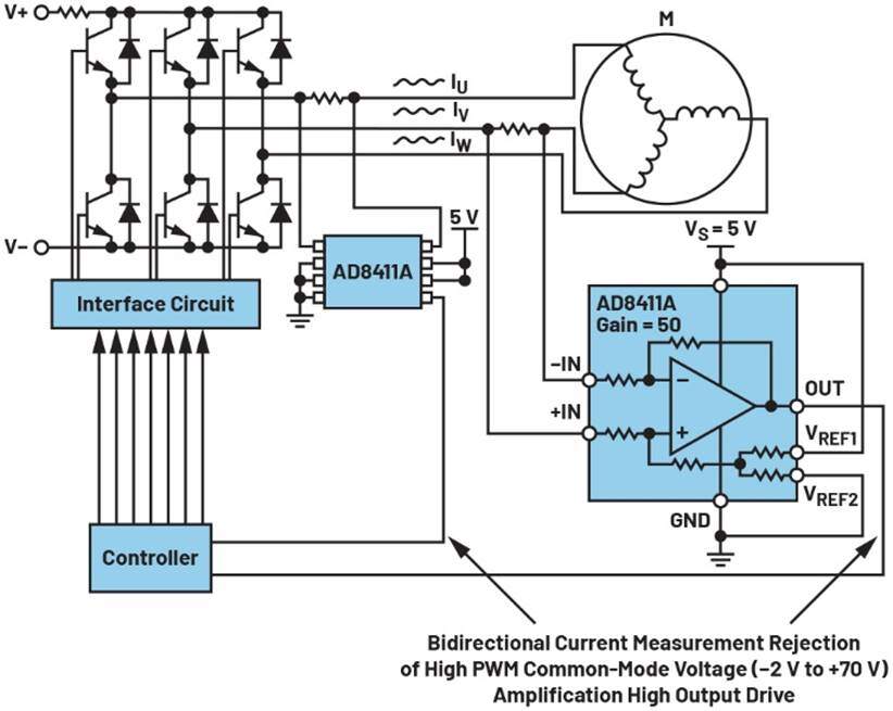 举个例子,在典型的三相电机控制系统中测量相位电流时,会发生共模电压快速切换,在该场景中,控制器将脉宽调制(PWM)信号驱动到逆变器级,然后逆变器级驱动电机的每一侧(图10)。分流电阻与电机并排放置。利用分流电阻上瞬时电流测量的差模电压反馈,控制器能够确定每个信号的相位。通过每个PWM脉冲,分流电阻上的共模电压在V–和V+之间的整个电源电压范围内快速步进。这些快速PWM步进要求放大器具有高带宽,且能够在上升沿和下降沿抑制高瞬态过冲。ADI公司的AD8411A在输入端集成了共模电压范围高达70 V的精密内部电阻分压器网络,采用2.7 MHz高带宽,并包含去毛刺电路,以通过降低快速开关输入信号的影响来实现输出精度,因此非常适合这类应用。