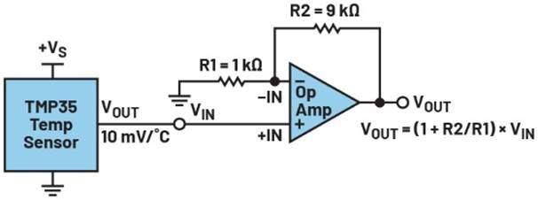图2.单端温度传感器输出和同相放大器电路。