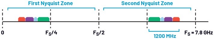 对于此类应用,观测接收器可配置为7.8 GHz,无缝覆盖Wi-Fi 6 GHz频段。图8显示了6 GHz频段位于第二奈奎斯特区的高频段范围,相应地,在第一奈奎斯特区,通过利用接收器数据路径上的NCO,反转的6 GHz频谱可转换为基带。