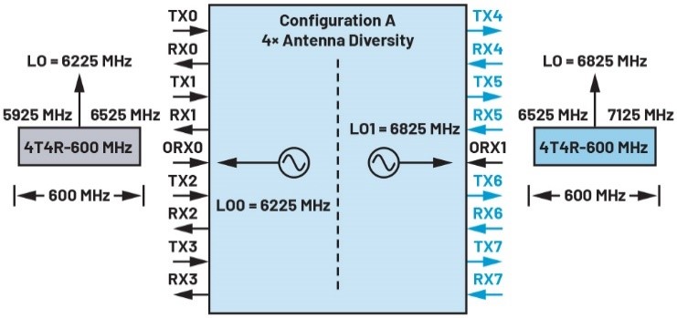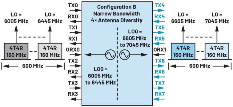 如前所述,这款收发器支持600 MHz IBW,通过与两个内部LO结合使用,单个芯片可覆盖整个1200 MHz频段。如图6所示,对于整个1200 MHz频段,收发器配置为支持四根天线(四个信道)。LO0用于信道0至3,以覆盖所有四个信道上的U-NII-5和U-NII-6。同样,对于U-NII-7和U-NII-8的信道4至7,LO1将配置为6825 MHz。两个600 MHz频段可通过高速JESD204C接口同时发送到基带。配置详情参见表3。