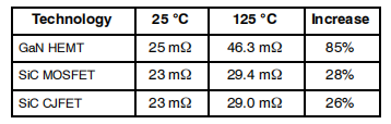 Rds,on会随温度升高而增加,其标称值仅适用于25℃的结温。下表对比了典型GaN器件、安森美(onsemi)M3S 650 V器件以及安森美第四代CJFET 750 V器件的导通电阻随温度上升的情况。