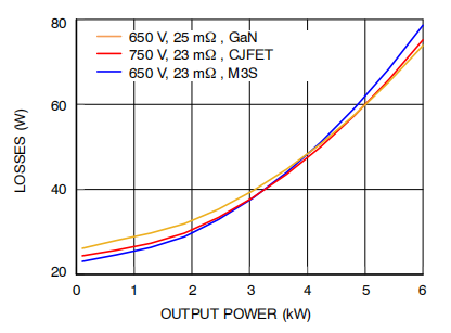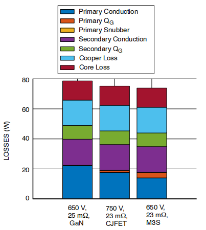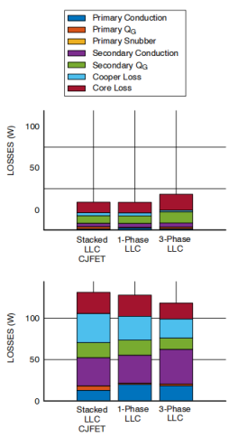 图2. 采用不同原边开关器件的堆叠式LLC转换器系统损耗
