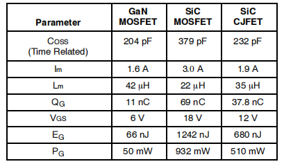 影响开关特性的主要差异源于器件的输出电容(COSS)。通常,SiC MOSFET具有较大的COSS,这是由于其需要更大的裸芯尺寸才能实现与GaN HEMT或SiC CJFET相当的导通电阻(Rds,on),如表2所示。该电容与励磁电流共同决定了半导体器件的开关转换速度。