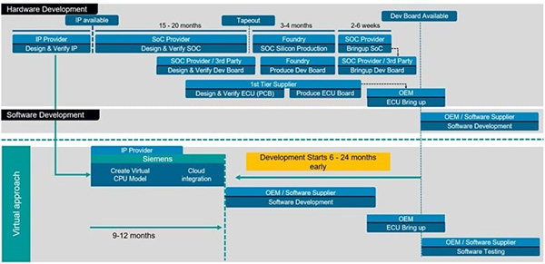 图 1:上图展示了传统硬件与软件开发周期;下图展示了采用虚拟硬件的更高效开发方法