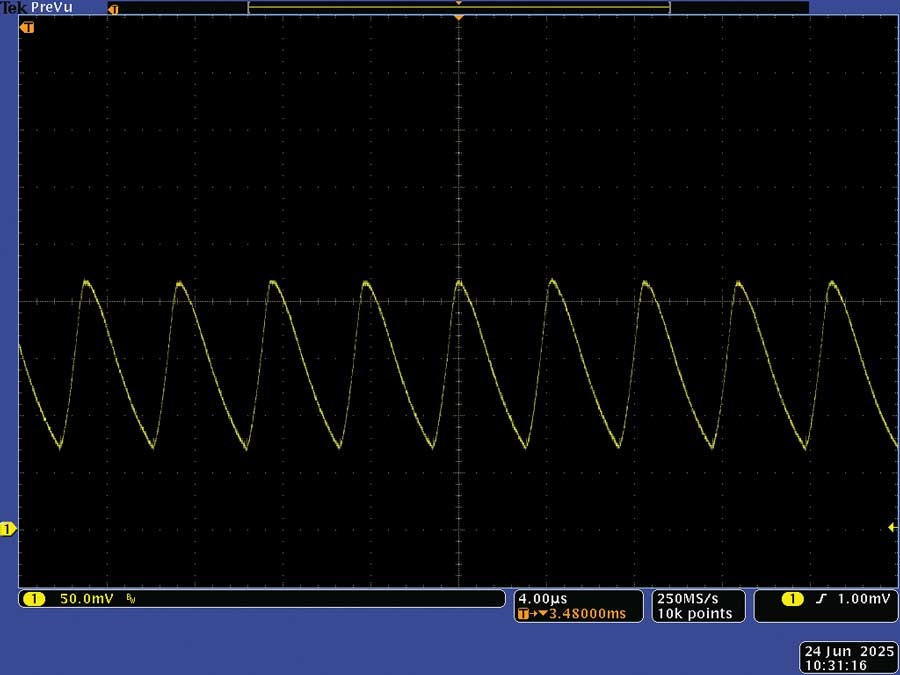 为了验证是否如此,将输入电压为15 V、输出电压为3.3 V的降压转换器LTC3891连接到4.3 A的负载,并在输入线路中插入图1所示电路。用7个并联1 Ω电阻代替50 µΩ检测电阻,得到142.8 mΩ的分流电阻。测量分流电阻两端的电压,结果如图5所示。