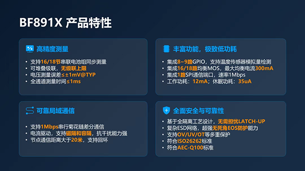 “油电同速”的奇迹,依托1500kW闪充桩的强悍功率,亦离不开二代刀片电池打造的“锂离子高速通道”,而BF891X系列AFE芯片,则是连接两者的“精准纽带”——它不抢镜、不张扬,却用专业的监测能力,让闪充从“暴力灌电”的猜疑变成“精准控电”的现实,既实现了速度的飞跃,又守住了电池安全与寿命的底线。