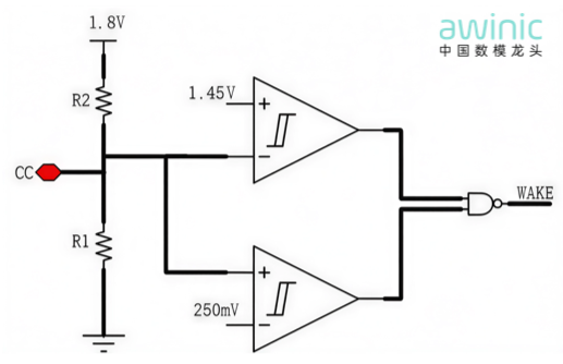 当用户配置芯片进入Wake mode后,将会使能内部兆欧级上/下拉电阻,从而用nA级别电流将端口CC引脚维持在0.9V左右电压,这将极大减缓端口的电腐蚀速度。而当设备插入或者水汽入侵后,将会打破这里的电压平衡进而发出WAKE中断,进入水汽检测和toggle状态。