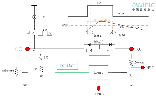 艾为的PD PHY系列芯片内部集成拥有专利保护的硬件水汽检测电路,并将其融入到toggle过程中,其原理结合下图解释: