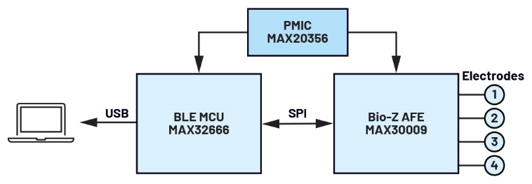 图5.采用MAX32666、MAX20356和MAX30009的生物阻抗测量系统框图