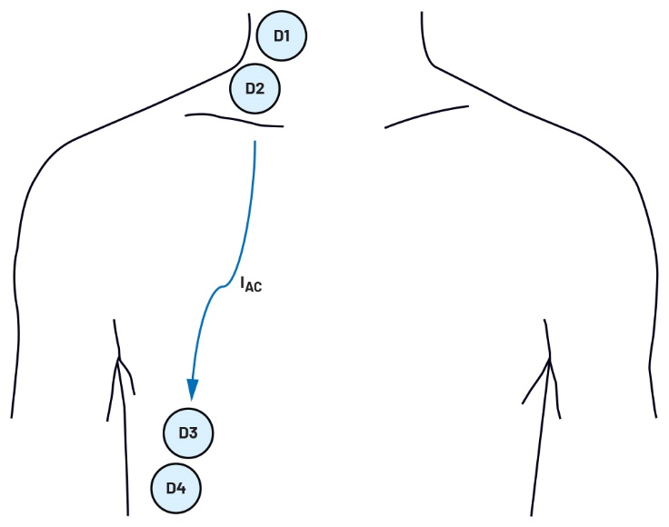 如图3所示,四个3M Ag/AgCl凝胶电极以标准配置布置,用于采集ICG信号。D1和D4用作一对激励电极,而D2和D3用作一对检测电极。高频电流通过D1注入人体,并通过D4返回到芯片。将恒定电流施加于胸部时,D2和D3电极之间会产生电位差。胸阻抗会随着心脏活动而变化,故电位差也会相应变化。这个变化的电位信号就是ICG信号。