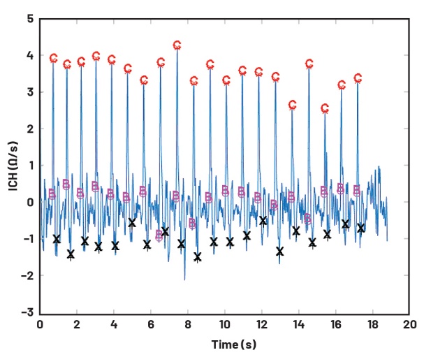 图7显示了利用图5所示系统获取的人体阻抗信号。图8展示了利用ICG特征点检测算法处理阻抗信号后获得的ICG信号,信号上标出了用于计算SV的特征点C、B和X。