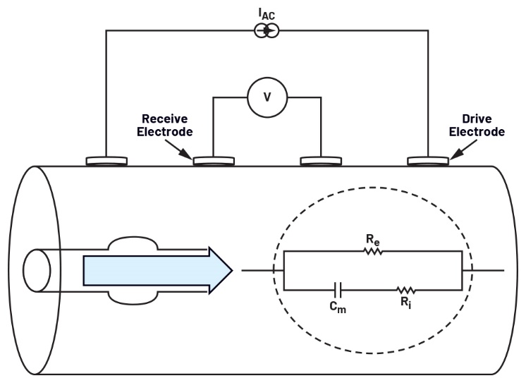 通过测量人体组织在弱交流电作用下的阻抗变化,可以获得反映血容量变化的心脏阻抗信号。人体由众多细胞组成,生物组织的电模型可以用图2所示的等效电路表示。在该模型中,Cm是细胞膜的并联电容,Re是细胞外液的电阻,Ri是细胞内液的电阻。需要注意的是,该电路中的Cm、Re和Ri并非表示单个细胞的膜电容和细胞内外液的电阻,而是整个生物组织的等效电容和电阻。该电路也被称为生物阻抗的RC三元素模型。本文采用广泛使用的四电极法来测量人体生物阻抗。此方法的原理是:通过一对电极施加激励电流,同时使用另一对电极提取电压。