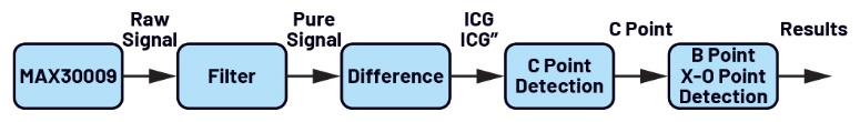 B点检测算法:在B点时间窗口内,ICG的二阶导数的最大值对应于B点。如果该最大值小于Cpeak的15%,则将ICG信号的过零点视为B点。如果未找到过零点,则将最接近0.15 × Cpeak的点作为B点。
