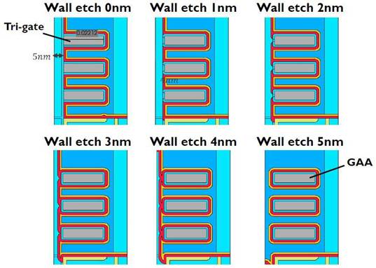 第四,“外壁叉状片”预计将优于内壁装置提供更优越的门控制,能够形成W门而非三门叉结构。更宽的绝缘壁使得在最后的RMG步骤中可以对壁面进行几纳米的蚀刻回压。这使得门极能够部分绕过通道的第四条边缘,形成一个W形门,并增强对通道的控制。通过TCAD模拟,imec研究人员发现蚀刻介质壁5nm是最优,能提升驱动电流约25%。
