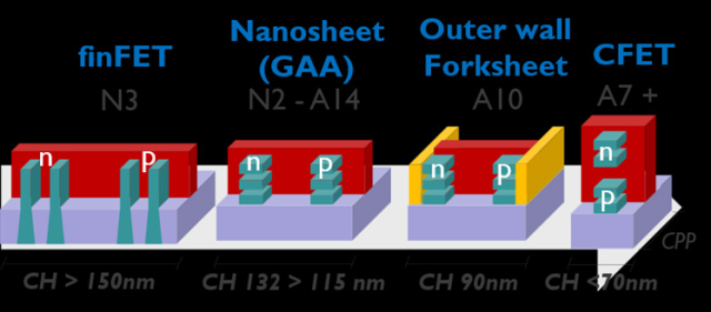 △imec的逻辑技术路线图,展示了GAA纳米片时代从2nm到A14节点的扩展,A10节点将转向“外壁叉状片”架构,随后A7及之后的节点将会转向CFET架构。