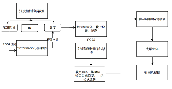 相机 → MixFormerV2跟踪器 → 手眼转换 → 底盘跟随节点 → 靠近停止 → 机械臂逆运动学规划 → 抓取执行。