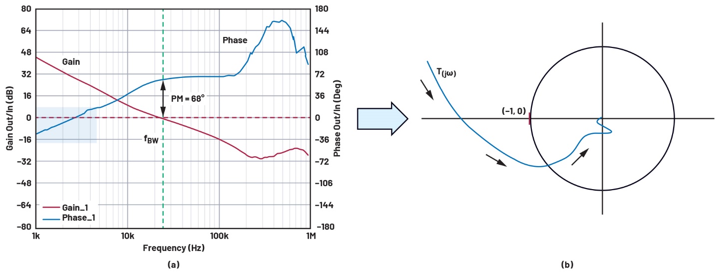图6.交越频率后增益曲线怪异的波特图(使用Simplis工具生成)及其相应的奈奎斯特图,证明这是一个稳定的系统:(a)环路波特图;(b)相应的奈奎斯特图。
