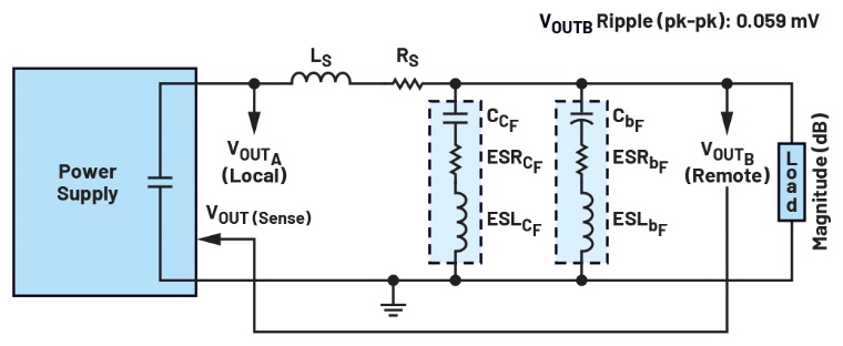 图11为产生图10所示电源波特图的电路反馈环路设置。在这种情况下,电源仍然包含一个附加后置滤波器L/C网络。然而,与图7所示电路图不同,图11的设计是在后置滤波器网络之后从远程负载侧(VOUTB)检测输出电压。