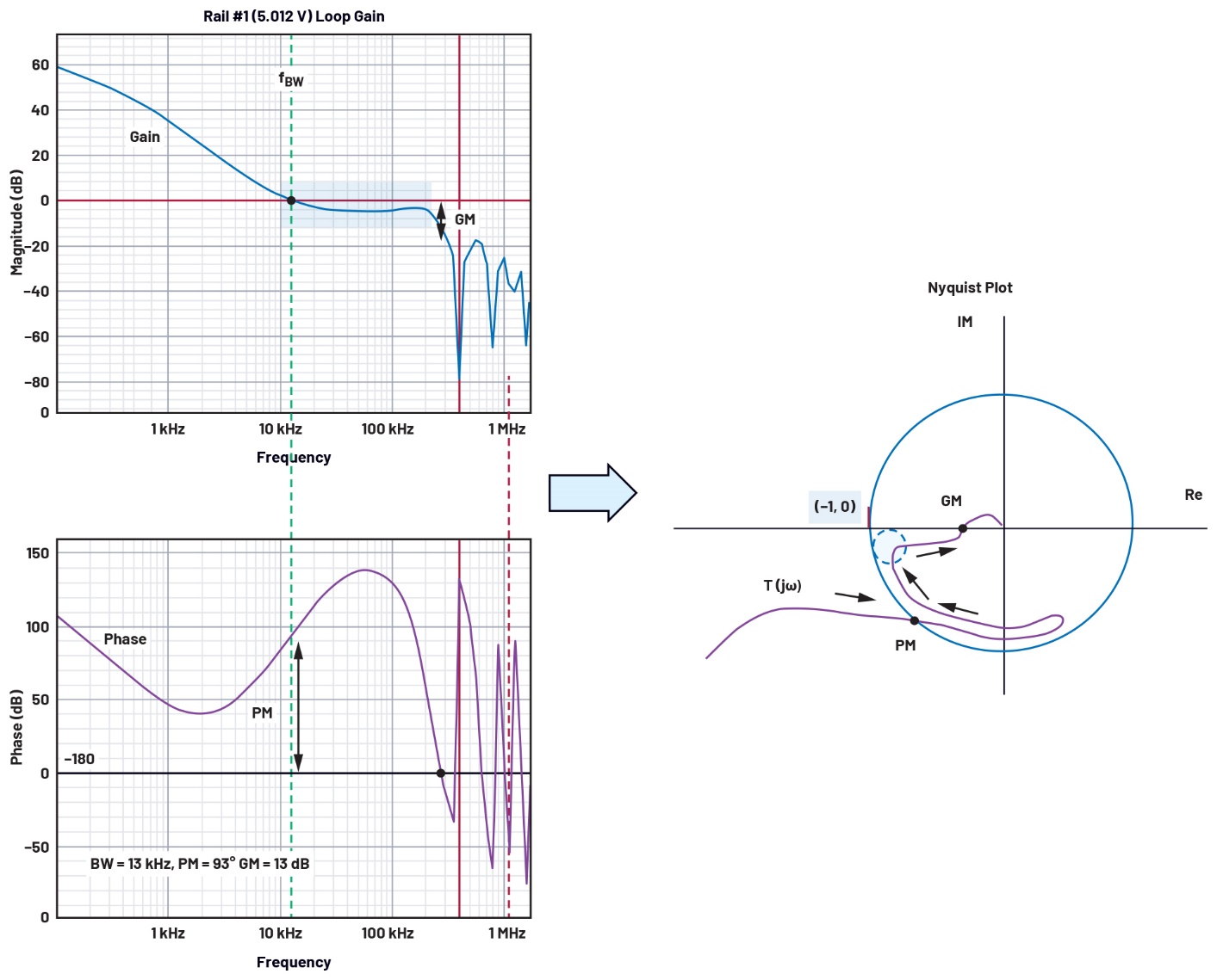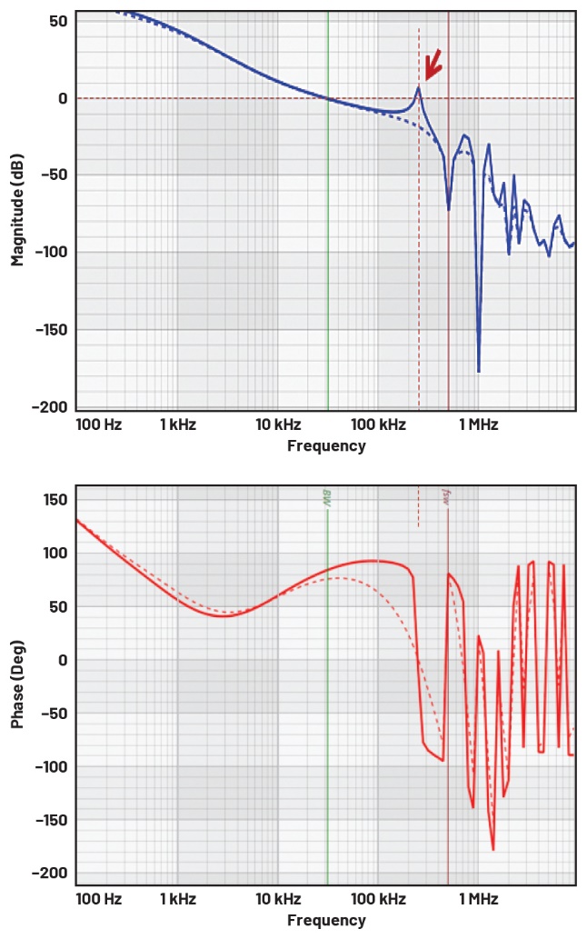 通过波特图交越频率处的相位裕量和相位 = -180°处的增益裕量,我们可以轻松地量化系统环路稳定性。然而,有时除了这两个点之外,我们还需要检查完整曲线,以确保系统有足够的稳定性裕量。