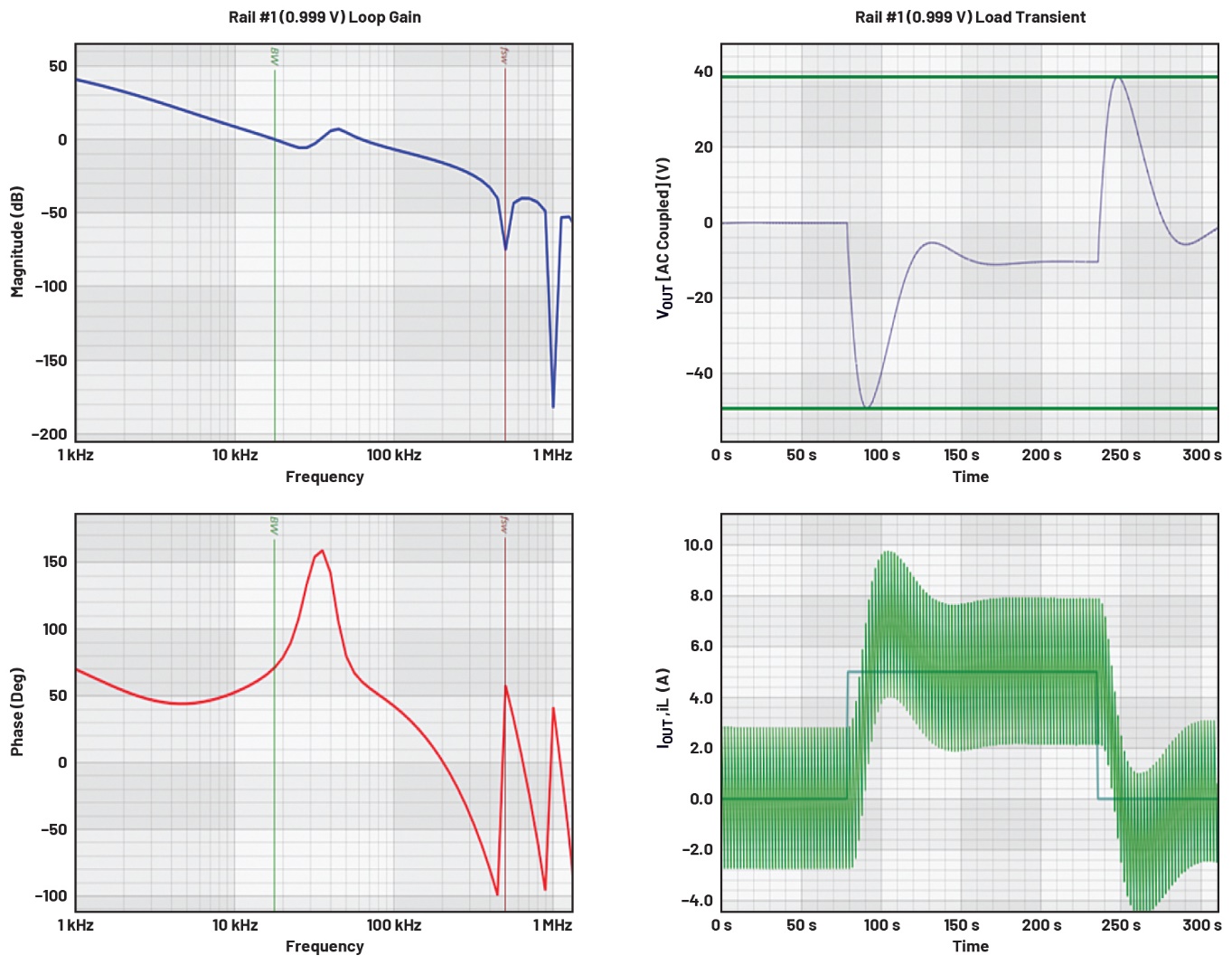 尽管环路增益曲线多次穿过0 dB线,但其相位仍然保持较高水平,这是否意味着系统不稳定?同样,我们可以通过相应的概念奈奎斯特图来判断,如图6b所示。图中显示,T(jա)曲线多次穿过单位圆,但并未以适当的距离包围(-1, 0)点。因此,根据奈奎斯特准则,这是一个非常稳定的系统。稳态和负载瞬态时域仿真进一步验证了该系统的稳定性,如图9所示。