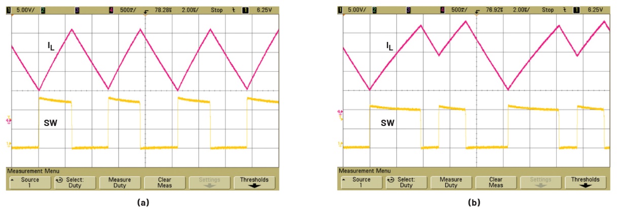 图15.峰值电流降压转换器在不同占空比条件下的开关波形:(a)正常运行(D = 41%,VIN = 12 V,VOUT = 5 V);(b)发生次谐波振荡(D ≥ 50%,VIN = 10 V,VOUT = 5 V)。