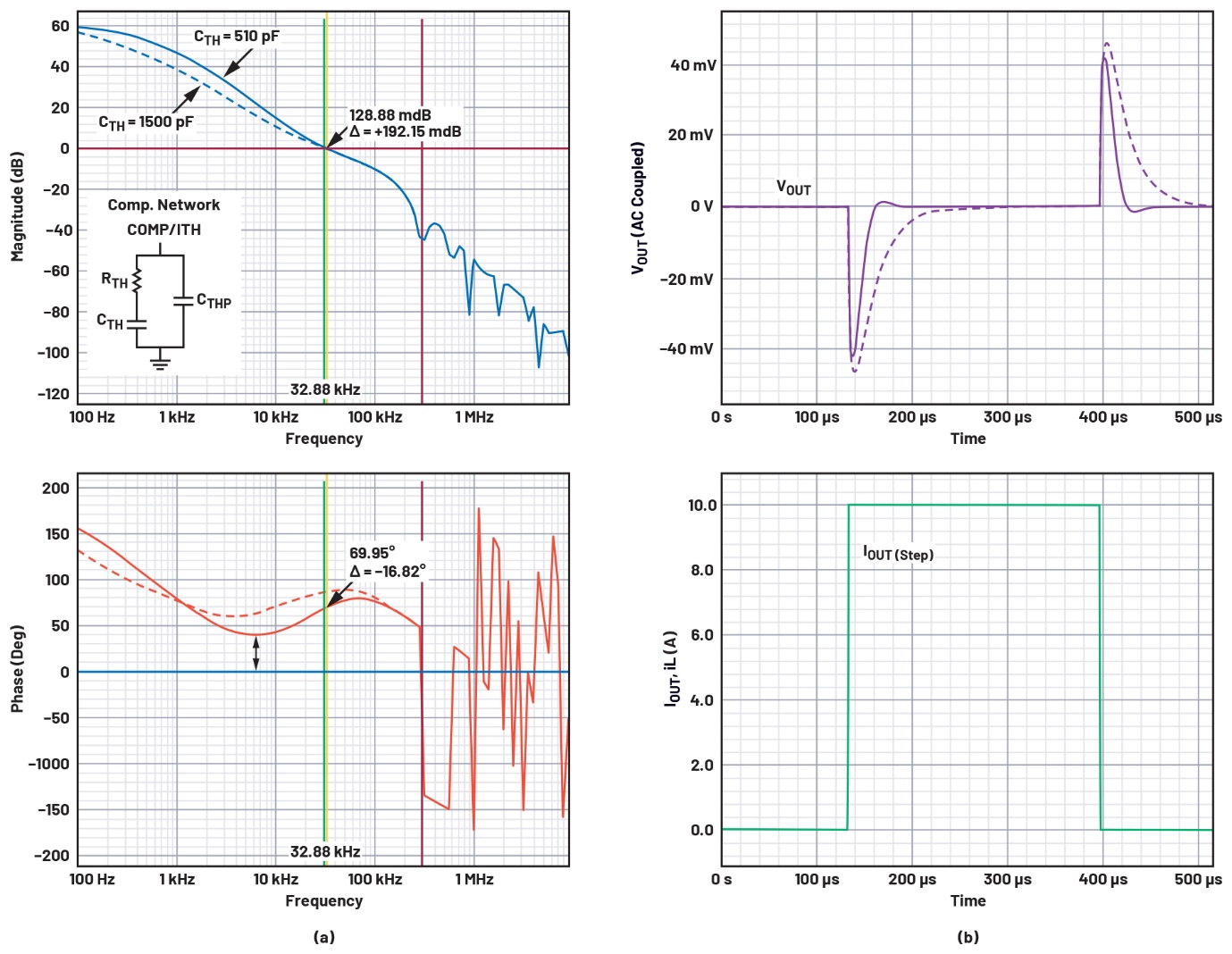 图1.LTpowerCAD中典型的LTC3833降压转换器波特图和负载瞬态响应(使用不同的补偿电容CTH值:实线:510 pF;虚线:1500 pF):(a)环路增益波特图;(b)负载瞬态响应。