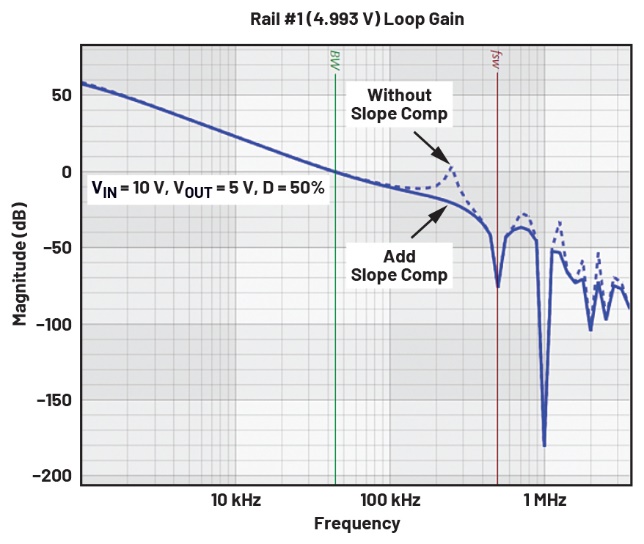 图16.图14中的转换器在有/无额外斜率补偿的波特图,占空比 = 50%。