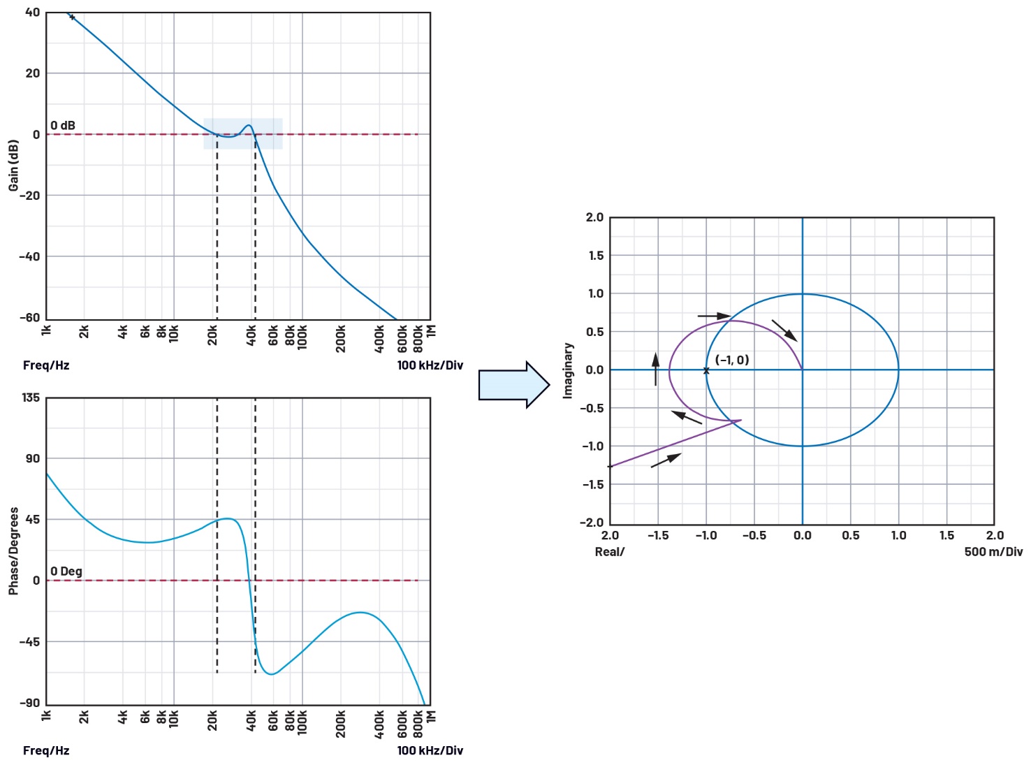 图10.一个不稳定系统的波特图示例和相应的奈奎斯特图(使用Simplis工具生成)。
