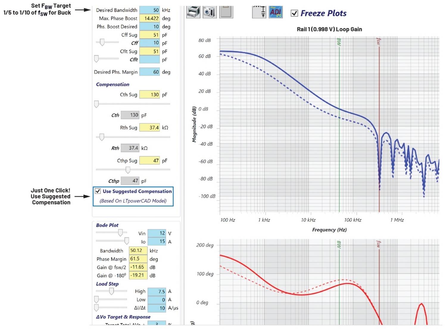图15.使用ADI LTpowerCAD设计工具中的“Use Suggested Compensation”选项,一键完成自动环路补偿设计。