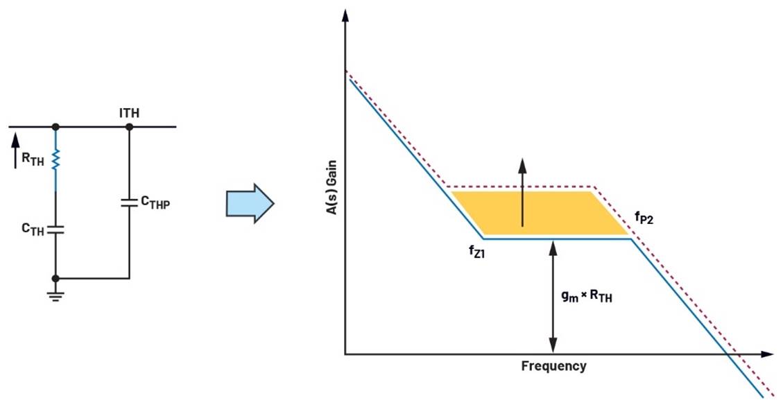 图5.增加RTH会提高fZ1和fP2之间的补偿增益A(s)。