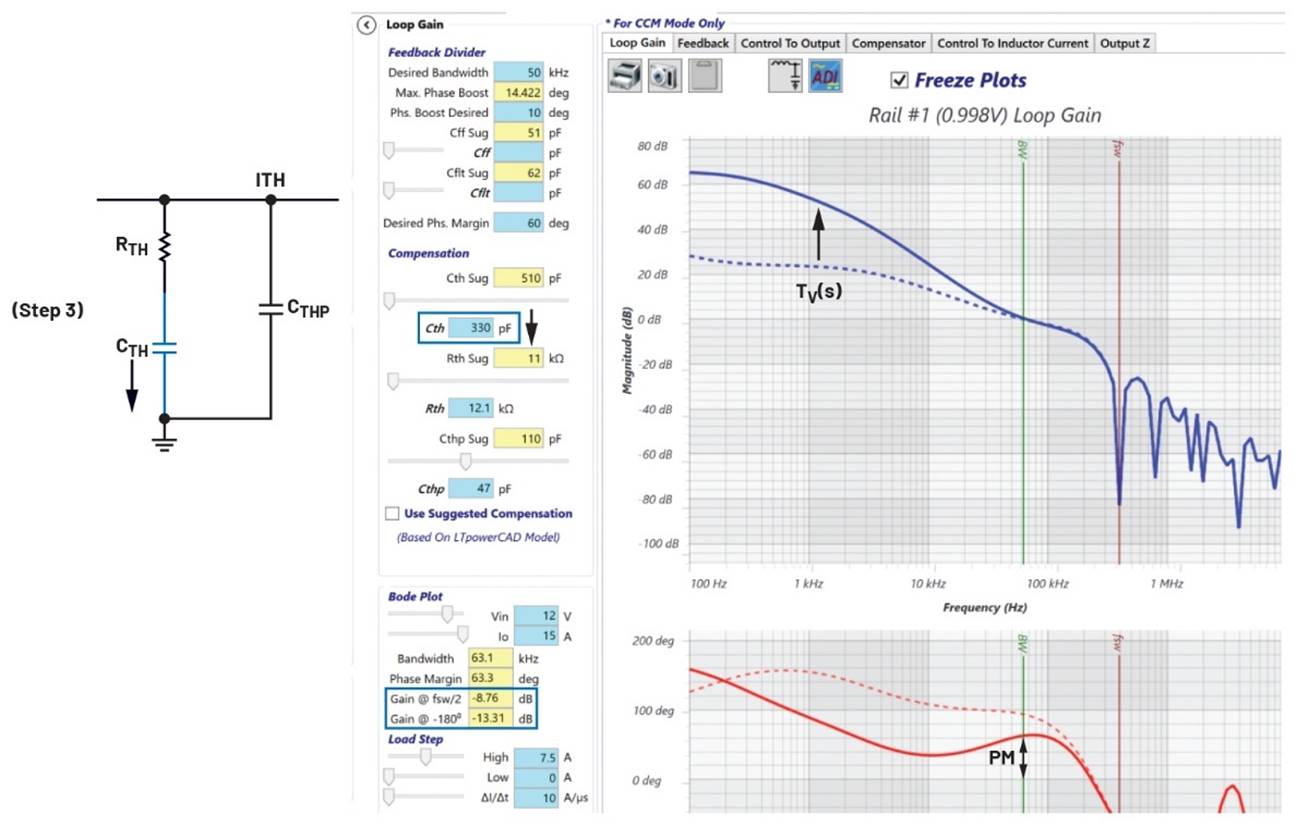图13.环路设计第3步:减小CTH值以缩短瞬态时间,直到电源相位裕量开始下降至所需的60°值。