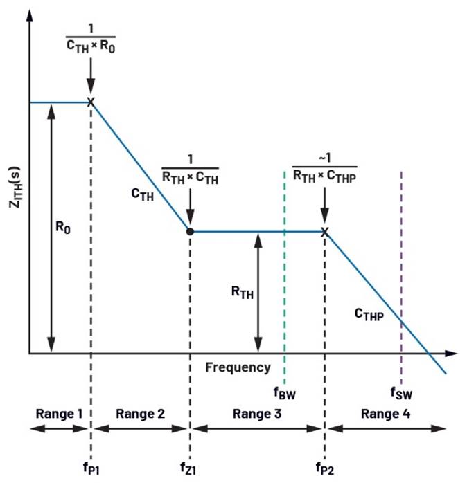 范围2:随着频率增加,第一个CTH电容阻抗开始下降(注意CTH>>CTHP,因此CTHP阻抗仍然非常高)。在频率fP1处,CTH阻抗幅度与RO相当。在fP1之后,随着频率进一步增加,CTH阻抗决定总ZITH阻抗。