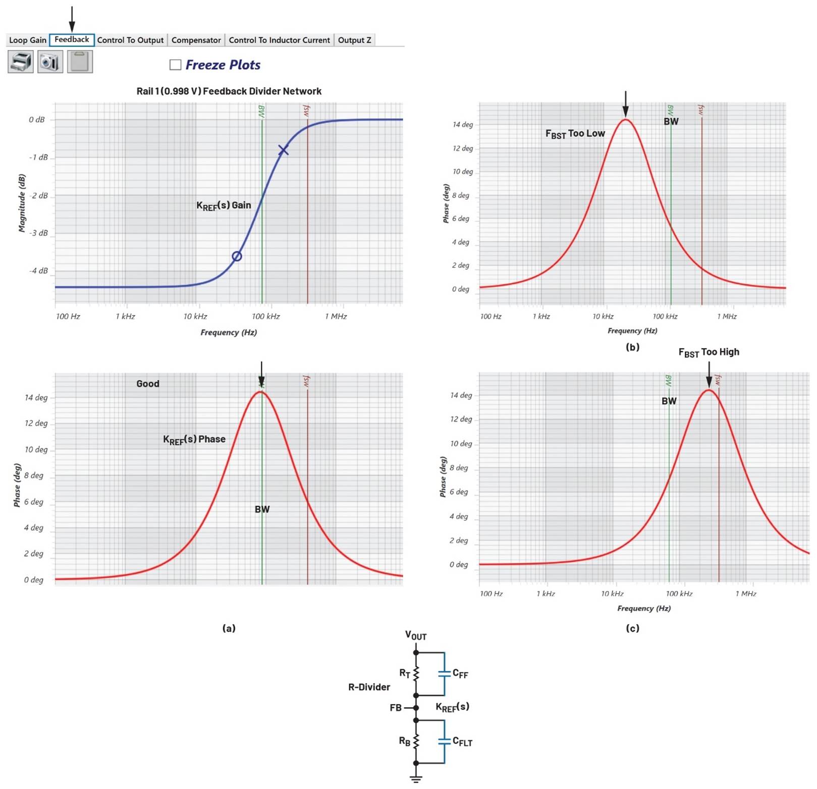 如果调整CTH、CTHP和RTH仍不能实现所需的环路带宽和稳定裕量,则可以添加前馈电容CFF和滤波电容CFLT,以进一步调整电阻分压器网络。这一步的目的是提升目标环路带宽周围的相位,通常借助CFF来实现。这可以在LTpowerCAD环路补偿页面上通过打开Feedback选项卡来完成。图14为电阻分压器电容设计的正确和错误范例。正确范例能大大提高目标环路带宽频率下的相位。