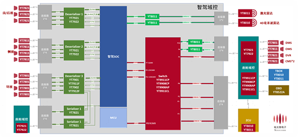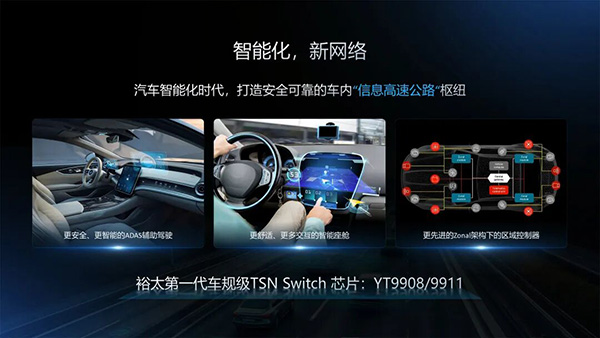 该系列芯片集成802.1AS,802.1CB 等多种TSN协议族,保障微秒级时延传输。在交换容量方面,YT99系列支持最高10G上行接口速率,集成100/1000 T1 PHY,总交换容量大于25G,支持多种配置方式,包括I2C/MDIO/SPI接口、以太网配置及OTA升级,充分满足智能汽车对高带宽网络的核心需求,广泛适用于自动驾驶、车载娱乐系统、车载中央网关等场景。
