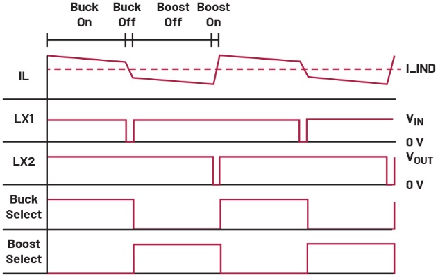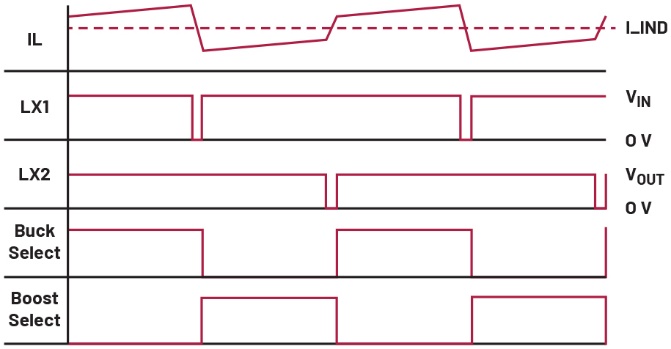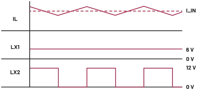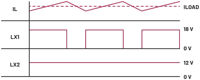 当降压模式的内部比较器因输出电压显著低于输入电压而触发时,电路将作为纯降压转换器运行。要在降压区域工作,开关3必须始终闭合,开关4必须始终断开。随后,开关1和开关2可像在普通强制脉宽调制(FPWM)降压转换器中那样切换LX1(见图2)。