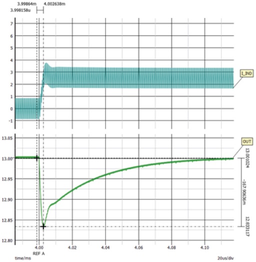 通过求解该公式,估算出输出电容为17.5 µF。将该值向上取整为22 µF。在选定元件后,可从升压区域开始设计补偿网络,以实现35 kHz的交越频率。选定Rcomp和Ccomp后,就必须针对18 VIN的降压区域对电路进行补偿。由于该区域不存在RHPZ,因此将交越频率选为100 kHz,随后可调节Rcomp2来实现这一交越频率。一切就绪后,需检查每种情况下的瞬态响应。由于添加了Rcomp2,降压区域和降压-升压区域中的瞬态响应得以改善。参见图8、图9和图10。