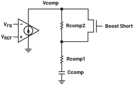 在对降压-升压集成电路进行补偿时,交越频率的选择必须考虑最坏情况下的负载、输入电压、输出电容值和电感值。由于降压-升压集成电路可在升压区域工作,最坏情况下的VIN可能会使电路进入纯升压模式。当电路工作在纯升压模式时,会受到RHPZ的额外限制。由于RHPZ与电感充电和向输出端传输能量之间的时间延迟相关,因此必须对环路进行补偿,使其频率为该零点频率的1/3至1/5。正因如此,即便在无RHPZ的降压区域有更大带宽可用,降压-升压电路的瞬态响应仍会受到限制。通常,为了补偿控制环路,会使用由补偿电阻Rcomp1和补偿电容Ccomp组成的阻容(RC)补偿网络,以提供合适的相位和增益。为了优化升压和降压区域的瞬态响应,可在RC补偿网络中额外增添一个电阻(Rcomp2),并在Rcomp2两端并联一个开关,使其根据电路工作区域来接入或断开补偿网络。当电路工作在升压模式时,开关将Rcomp2短路,从而降低交越频率;当电路进入降压-升压或降压区域时,开关断开,Rcomp2有助于进一步提升增益和相位。这将产生提高交越频率的效果。这种工作方式可使电路在升压区域具有足够低的交越频率,同时在降压区域具有足够高的交越频率(见图7)。